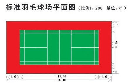 羽毛球场地标准 羽毛球场为一长方形场地,长度为13.40米,双打场地宽为6.10米,单打场地宽为5.18米。球场上各条线宽均为4厘米,丈量时要从线的外沿算起。球场界限好用白色、黄色或其它易于识别的颜色画出。 按国际比赛规定,整个球场上空空间低为9米,在这个高度以内,不得有任何横梁或其它障碍物,球场四周2米以内不得有任何障碍物。任何并列的两个球场之间,少应有2米的距离。球场四周的墙壁好为深色,不能有风。