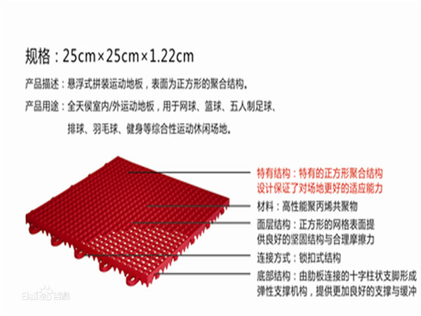 6、耐用性:该产品所用原料聚丙稀(PP)为高强度材料,加入具有抗紫外线辐射、抗氧化、抗寒等原料的改性聚丙稀,使该产品具有耐压、耐冲击、耐高低温、使用寿命长等优点。耐候性极高,不怕日晒高温、雨淋潮湿、冰雪严寒、永不翘曲剥落变形。没有气候地域限制,雨后场地不积水。