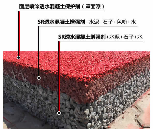 透水地坪面层:SR透水混凝土增强剂+425水泥+石子+水+色粉
